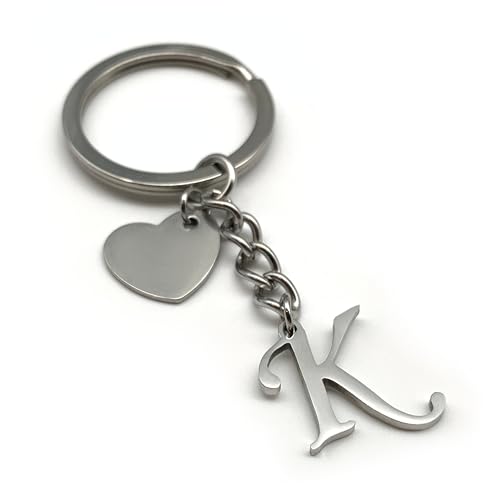 Nyckelring med Bokstav och Hjärta - Namn A-Z brev - Handgjorda hänge i rostfritt stål - Present pojkvän flickvän partner bil (K)
