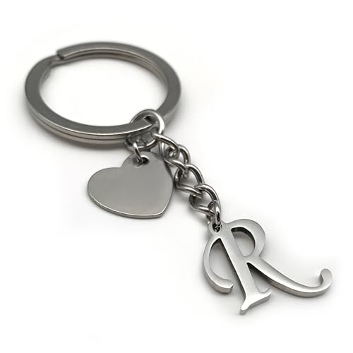 Nyckelring med Bokstav och Hjärta - Namn A-Z brev - Handgjorda hänge i rostfritt stål - Present pojkvän flickvän partner bil (R)