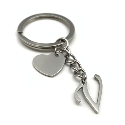 Nyckelring med Bokstav och Hjärta - Namn A-Z brev - Handgjorda hänge i rostfritt stål - Present pojkvän flickvän partner bil (V)