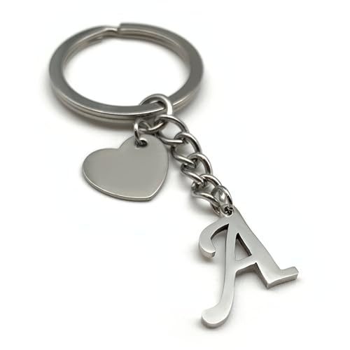 Nyckelring med Bokstav och Hjärta - Namn A-Z brev - Handgjorda hänge i rostfritt stål - Present pojkvän flickvän partner bil (A)