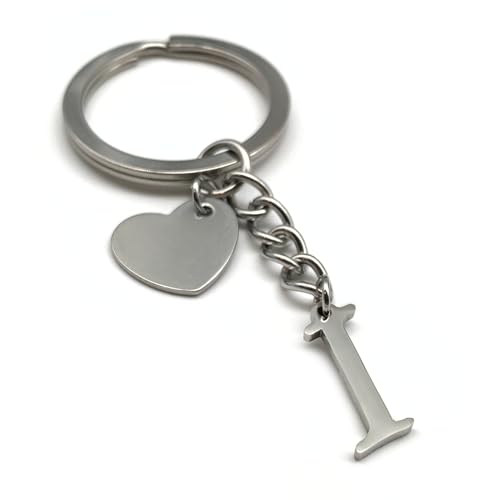 Nyckelring med Bokstav och Hjärta - Namn A-Z brev - Handgjorda hänge i rostfritt stål - Present pojkvän flickvän partner bil (I)