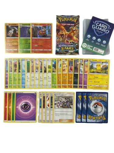 Pok-set med 50 Pokemon kort utan dubbletter + 1 slumpmässig Pokemon Booster + 2 glansiga gåvokort + 1 sällsynta kort! + 100 Heartforcards® Card Guard fickor