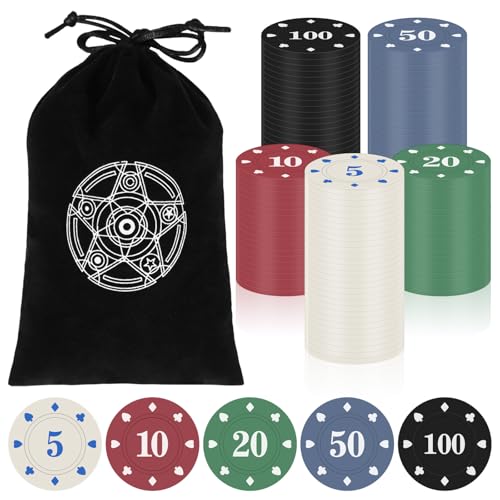 Zocipro 110 stycken pokerchips, jetons-chips, pokerchips med nominella värden och svarta sammetspåsar, festtillbehör för spelkvällar, kasinochips för poker, blackjack och casinospel