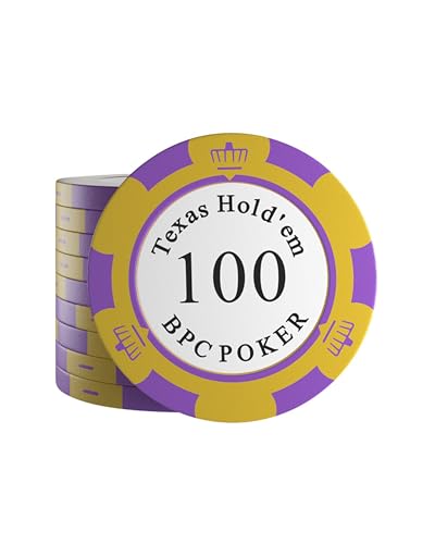 Bullets Playing Cards, 25 Clay Pokerchips Carmela för pokerset, värde 100, 14 g, 4 cm diameter, färg gul, lila..