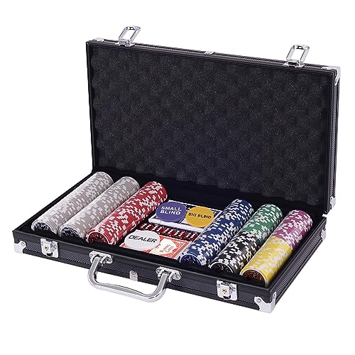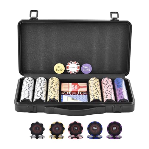 GOPLUS pokerset med 300 laserpokerchips, pokerfodral med 14 g chips och 2 kortkortlekar och 3 dealer-knappar och 5 kuber, låsbar poker, komplett set med aluminiumfodral och nycklar, svart (500 chips)