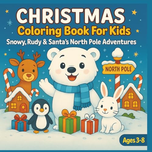 Christmas Coloring Book For Kids: Snowy, Rudy & Santa's North Pole Adventures, Ages 3-8