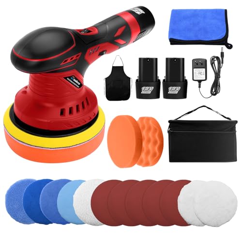 Daakro Poleringsmaskin röd med 2 x 3 000 mAh batterier och laddare, bilpolermaskinset, 6 hastigheter, bilbatteri polervaxmaskin, 145 mm polerplatta, 17 st poleringstillbehör