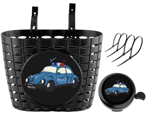 YeloYolker Cykelkorg för pojkar med klocka, söt cykel främre styre korg för barn, småbarn, plastskoterkorg (polisbil)