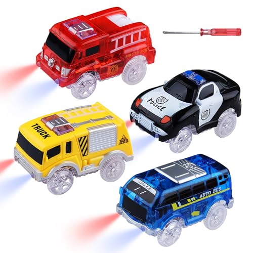 4-pack leksaksbilar tracks Cars Magic bilar lyser i mörkret för barn 3–8 år, polisbil, buss, brandbilar, lastbilar med 5 LED-lampor, billeksak, ersättning som kör på räls
