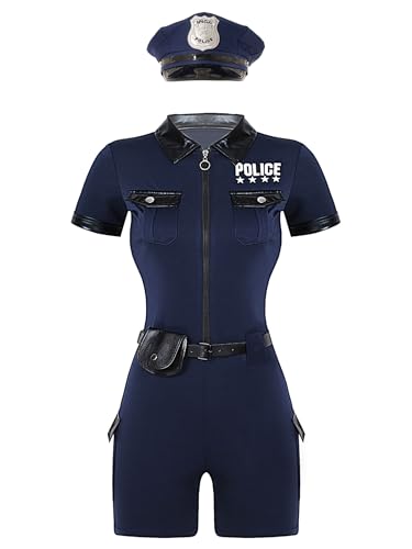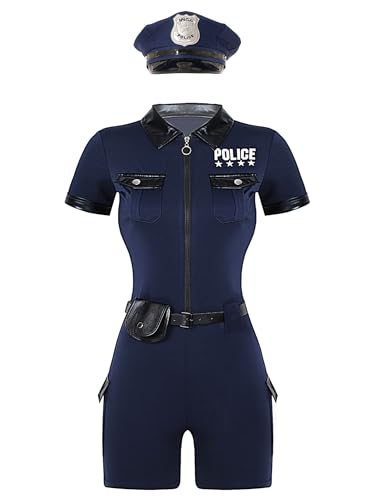 Freebily Polisdräkt Kvinnor Sexig Polisdräkt Kortärmat Polisuniform Rollspel med Bälte Väska Hatt Jumpsuit Police Officer Kostym Mörkblå S