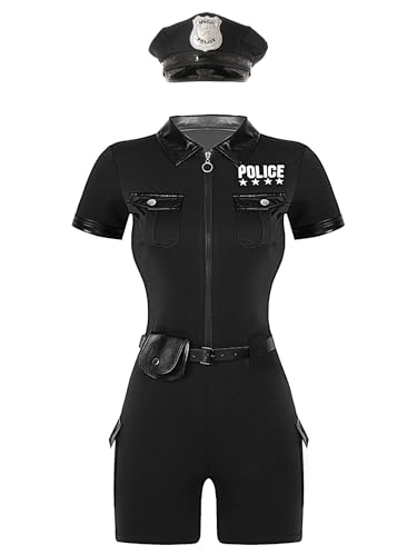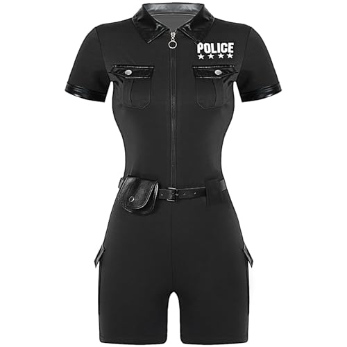 Freebily Kvinnor Sexig Polisdräkt Polisdräkt Kortärmat Polisuniform Rollspel med Bälte Väska Hatt Jumpsuit Bodysuit Police Officer Kostym Svart M