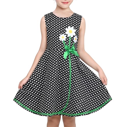 Flickor Klänning Svart Polka Dot Tusensköna Broderi Varje dag Sommar 8 år