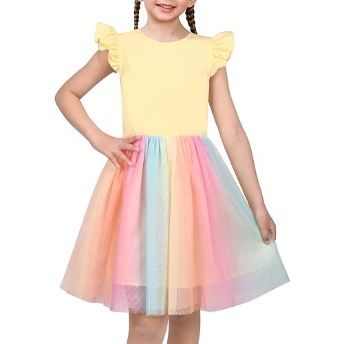 Flickor Klänning Regnbåge Gul Ruffle ärm Polka Dot Crewneck Tyll Tillfällig 4 år