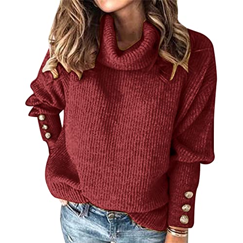 Grovstickad tröja dam oversized: vintertröja dam varm lång stickad tröja grovstickad polotröja tröja långärmad vintertröja enfärgad polotröja bomull långärmad tröja varm tröja, vin, M