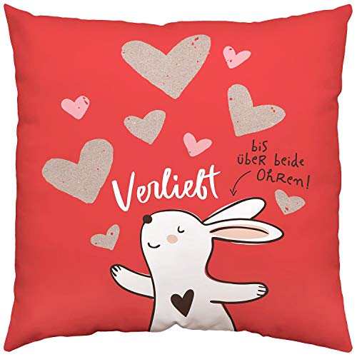 Happy Life 45336 Bomullskudde, med kanin, kär till över båda öronen, 40 cm x 40 cm prydnadskudde, fodral, fyllning 100% polyester, röd vit
