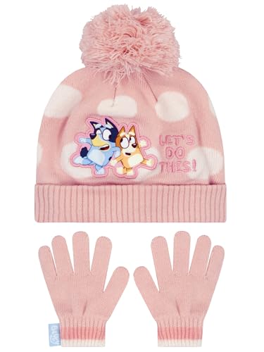Bluey Mössa Och Handskar Set | Flickmössa Och Handskar | Pom-Pom Mössa Co Ord | One Size Rosa