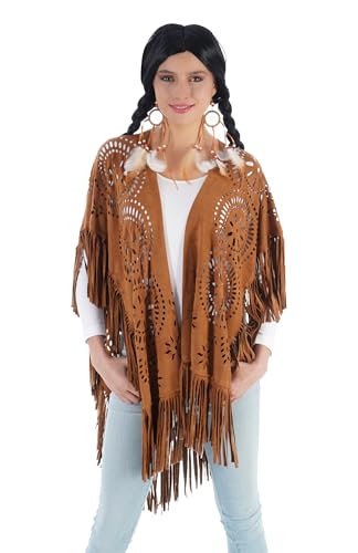 Chaks Indisk poncho, brun i läderutseende med indiska fransar och motiv, kostym för festival, karneval och temafester