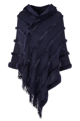 Ferand Poncho dam med huva, varm vinterponcho, randig cape med fransar elegant, vit, Marinblå, One Size