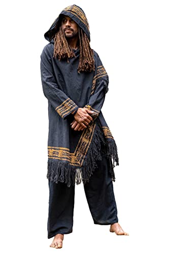 JUBBA Svart herrkappa med huva långärmad poncho jacka festival tribal dystopisk apokalyptiskt block tryckt steampunk handgjord dyn, Svart, one size