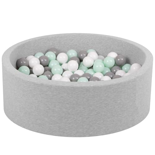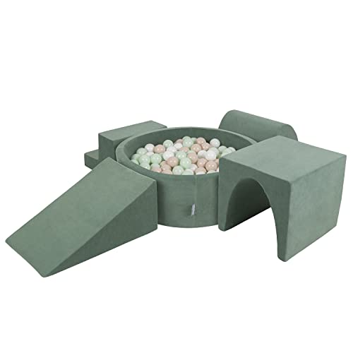 KiddyMoon Velvet skumlekplats med rund bollpool för barn pool (300 bollar), skogsgrön: pastellbeige/vit/mynta