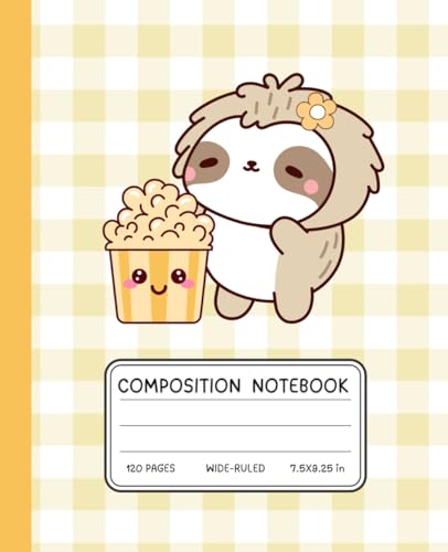 Kawaii Sloth Popcorn Notebook | Cute Yellow Composition Book | 7.5" x 9.25", 120 Pages: Adorable Wide Ruled Journal with Sloth & Popcorn for Girls, Kids & Animal Lovers | Back-to-School Diary