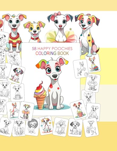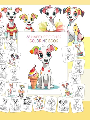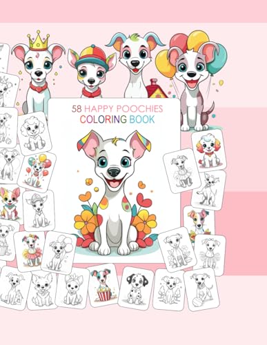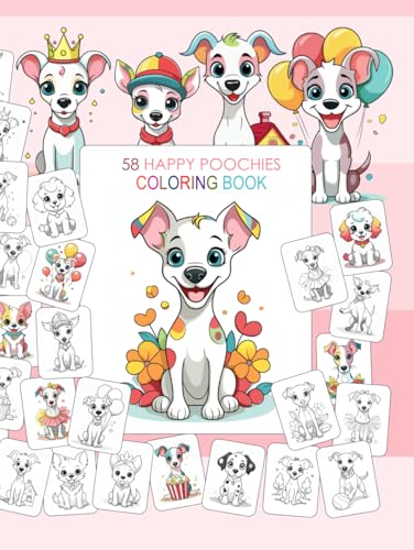 58 HAPPY POOCHIES: Smiling, Sweet, Happy & Adorable Dogs - 58 Cute Designs for Kids, Teens & Adults - Balloons, Flowers, Popcorn, Candies, Ballerinas, Stars, Etc.
