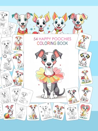 54 HAPPY POOCHIES COLORING BOOK:: TONS of FUN. Smiling, Sweet, Happy & Adorable Dogs - 54 Cute Designs for Kids, Teens & Adults - Balloons, Flowers, ... Popcorn, Candies, Ballerinas, Stars, Etc.