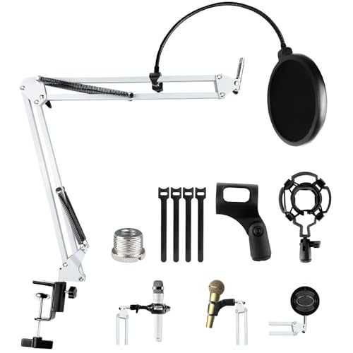 Relota Justerbar mikrofonarm, vitt mikrofonstativ med popfilter, mikrofonklämma, 5 kabelfästen, stötsäker, mikroupphängningsstång för studio, sändning, inspelning, spel