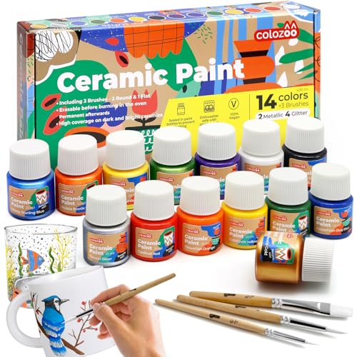 Colozoo Glas- och Porslinsfärg Diskmaskinssäker - 14x20 ml Glasfärg inkl. Guld, Silver, 4 Glitterfärger och 3 Penslar - Keramikmålningsset Raderbart Före Bakning och Vattentätt Efteråt