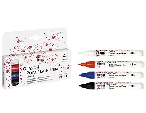 Kreul 16440 - Klassisk fin glas- och porslinspenna, 4 färger i en uppsättning, formhållande spets, linjebredd ca 1–2 mm, vattenbaserad matt färg för glas och porslin