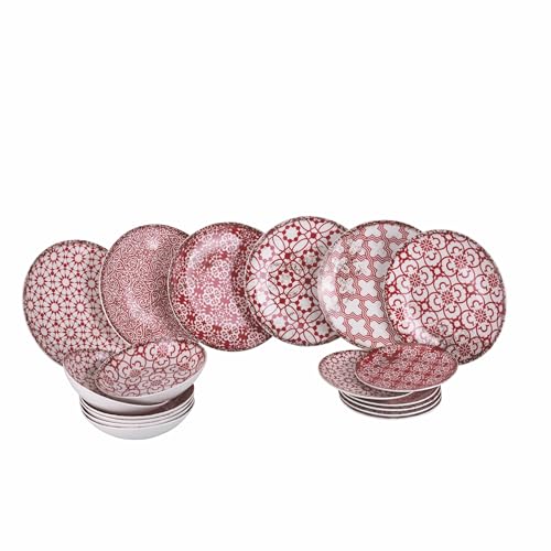 Delys 545960 18-delad porslinsservis för 6 personer - platta tallrikar, ihåliga tallrikar, desserttallrikar - röd eller grå färg - BAYADERE-dekor