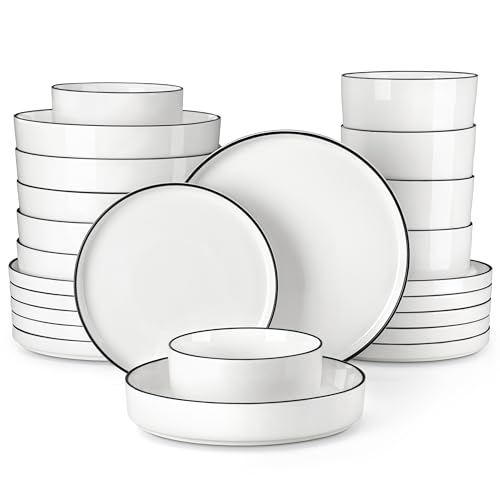 MALACASA 24-delars porslinsservis med porslin, fat set för 6, premiumtallrikar och skålar set, flis- och repbeständig, vit med svart kant, serie LEAH