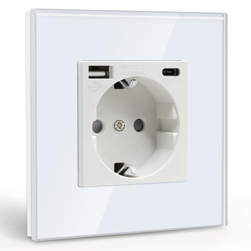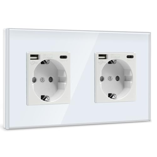BSEED USB-uttag, dubbelt, vitt Schuko-uttag med USB-anslutning (max. 2,1 A), typ C-port, infällt uttag av glas, skyddskontaktuttag, laddare för mobiltelefoner, bärbara datorer med mera