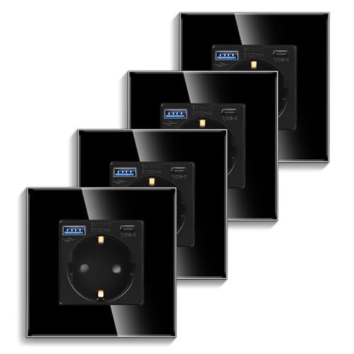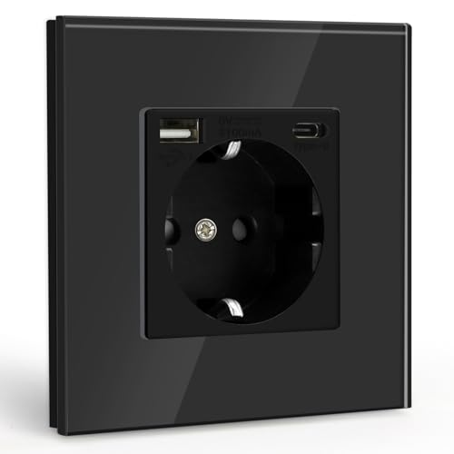 Jimeida Ett uttag med USB i svart, 16 ampere, skyddskontakt-uttag i glas med snabbladdning, USB-anslutning och typ C-port max.3,1 A, infälld skyddskontakt vägguttag – 86 mm, 250 V, 1 fack