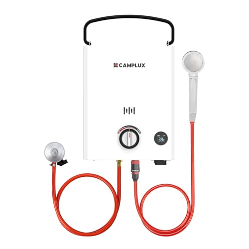 CAMPLUX Gasvarmvattenberedare 5 liter med justerbart handtag F5, bärbar LPG-dusch, butan (28–30 mbar)/propan (37 mbar), för camping/husbil/ladugård, första serien