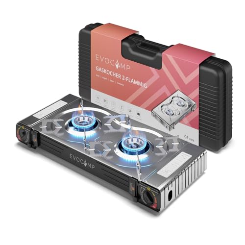 EVOCAMP 2 brännare portabel gasspis med piezo tändning, Campingspis för gaspatroner MSF-1a 227g, Bärbar Gaskokare