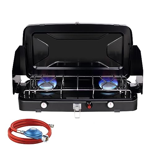 KEMPER - Vikbar gasspis med 2 lampor 4 600 W - piezo bärbar campingspis, dubbel rostfri brännare, 7/16 tum ventilpatron