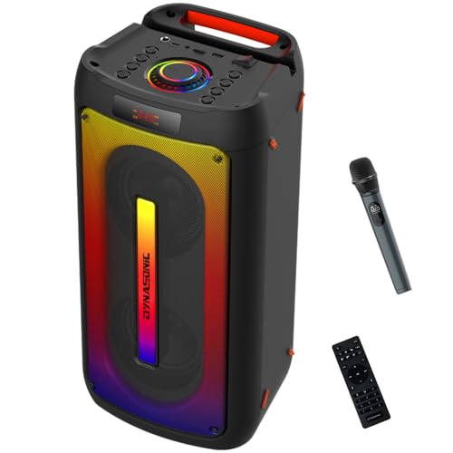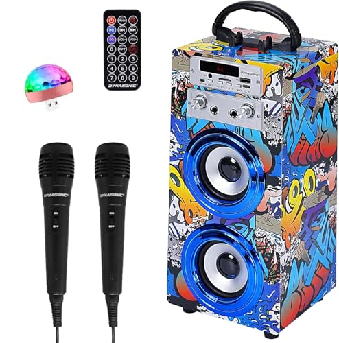 DYNASONIC - Bärbar Karaoke-maskin med 2 mikrofoner, Bluetooth-högtalare, ljus, USB- och SD-spelare, present till barn 5–13 år