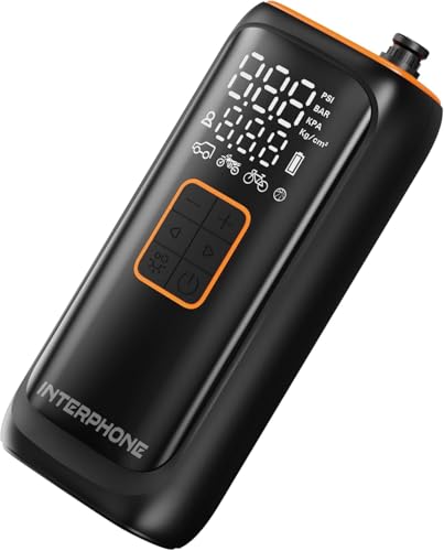 INTERPHONE Uppladdningsbar motorcykel bil cykel bärbar kompressor - gummiuppblåsningssats - upp till 4 däck - 4 minuters gummi - LED-ljus - tryckdisplay