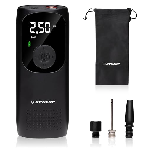 Dunlop Bärbar Luftkompressor 150 PSI - Trådlös Bildäckspump med USB-C-anslutning - Cykelpump för alla ventiler - Bollpump - Kompressor 10 bar med manometer - Plast - Svart