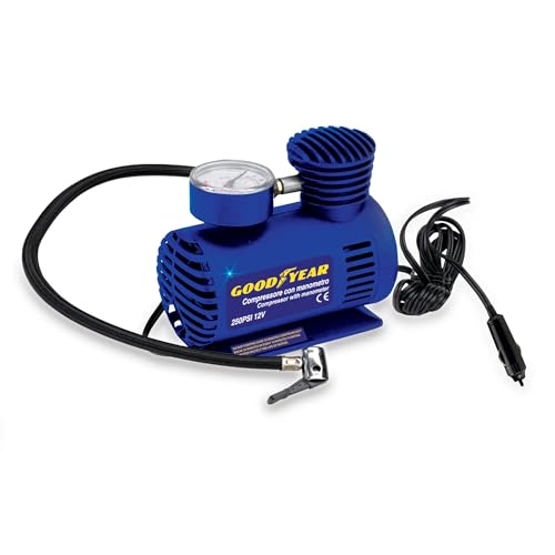 Goodyear kompressor med tryckmätare, 12 V 250 PSI för bil, motorcykel, cykel- och sportutrustning, med 4 tillbehör ingår, cigarettändaruttag, bärbar kompressor