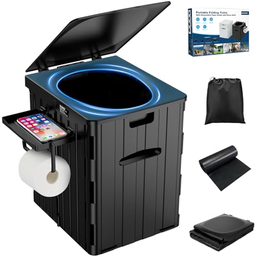 WADEO Bärbar Campingtoalett, Hopfällbar Toalett Med Näsduk/Mobiltelefonhållare, Vikbar Toalett, Biltoalett för Kvinnor och Män, Lämplig för Vandring, Resor, Förvaring (Svart)