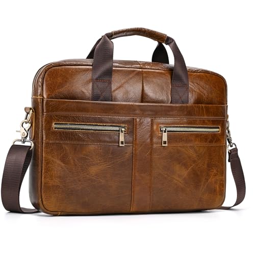 KomalC 18 tums läder portfölj laptop messengerväskor för män och kvinnor bästa kontor skolväska väska, Brun, L, Kurirväska