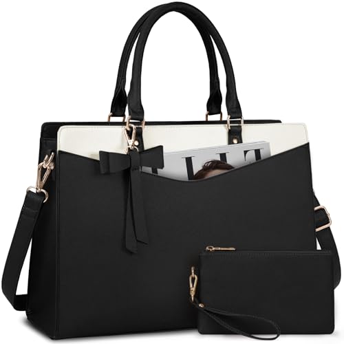 RAINSMORE Laptopväska dam 15,6 tum shoppingväska väska stor handväska med plånbok arbetsväska portfölj PU-läder lärarväska affärsväska, Svart och vit, 15,6 Zoll