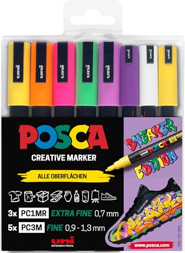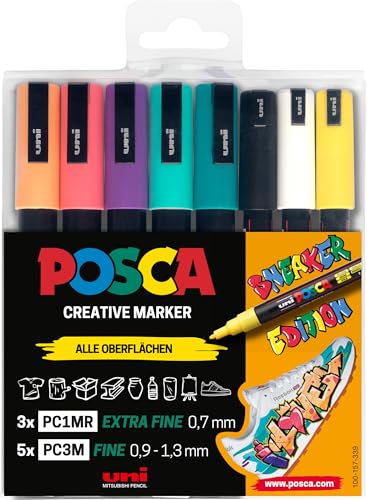 POSCA 186827 – POSCA märkpenna set sneakers pennor, fodral med 8, täckande på ljusa ytor