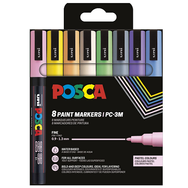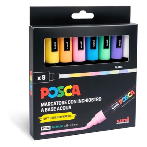 Posca - UniPosca Komplett set med 8 markörer Pastell, Punta Media 2,5 mm - Brevpapper med akrylmarkörer Uni Posca, Gäller även som färger för tyger, Trä, Glas, Keramik och mer