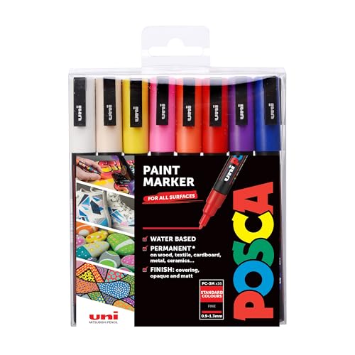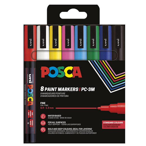 POSCA PC-3M vattenbaserade permanenta färgpennor. Premium medium spets för konst och hantverk. Användning med flera ytor på trä, metall, papper, kartong, glas, tyg, keramik och sten. Set med 8