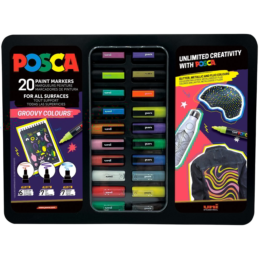Uni-Ball 186831 POSCA märkpenna set, 20 akrylpennor i pennfodral, Groovy Colours märkpenna set, PWE5M-spets 1,8–2,5 mm