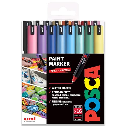 POSCA PC-3M vattenbaserade permanenta färgpennor. Fin spets för konst och hantverk. Användning med flera ytor på trä metall papper kanvas kartong glastyg keramik sten sten gren porslin. Set med 16