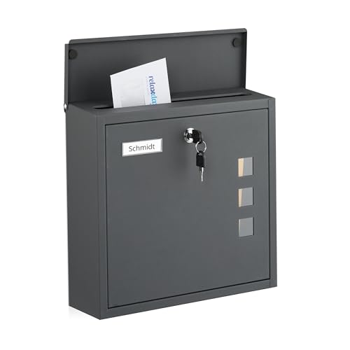 Relaxdays brevlåda med visningsfönster, H x B x D: 33 x 35 x 12 cm, järn, 4 nycklar, postlåda liggande format, antracit
